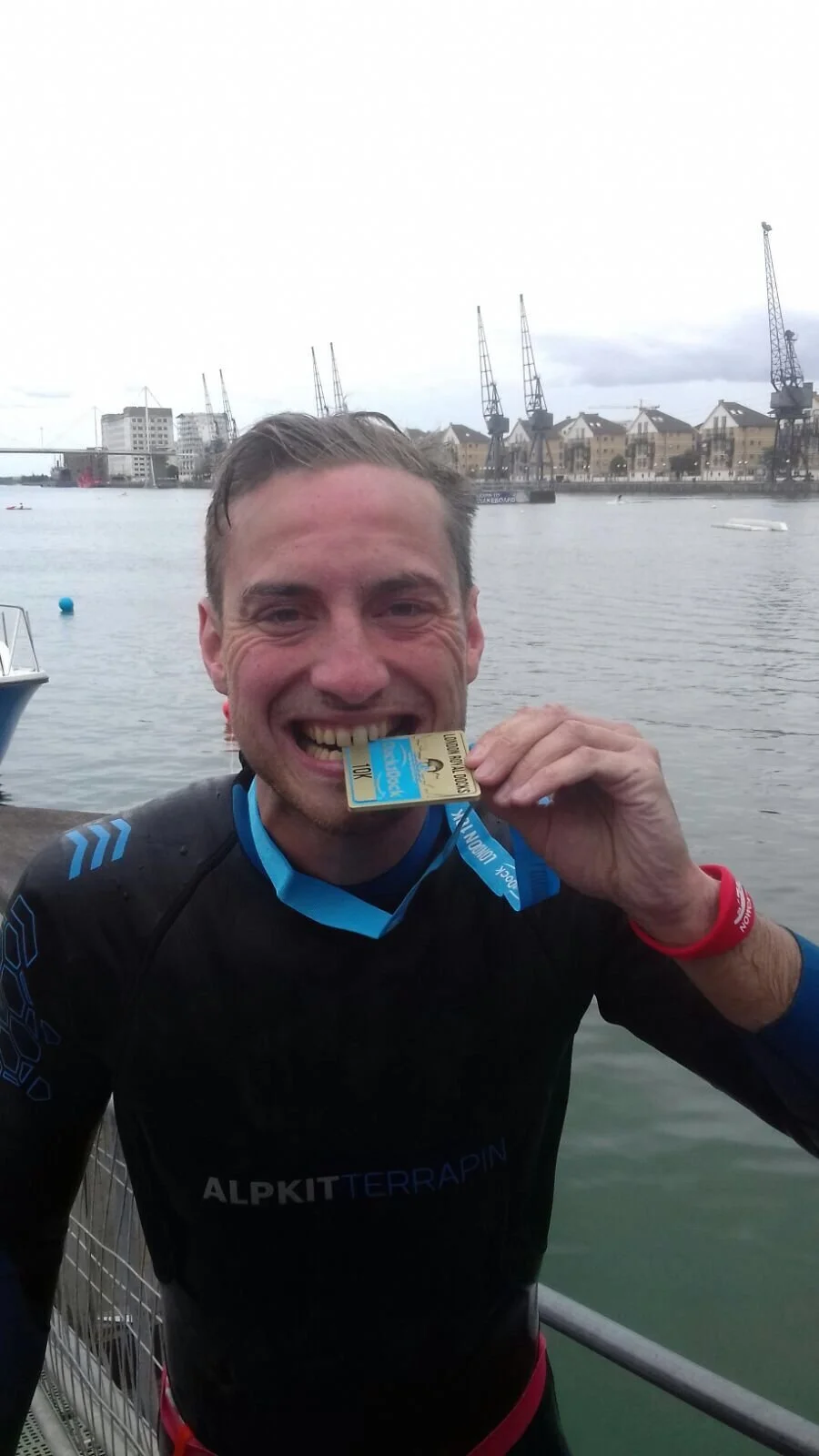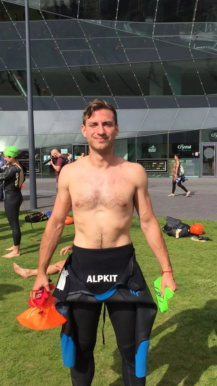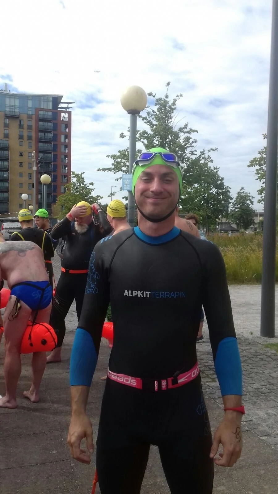 Middle Brother Calum getting with the kit on for his first 10km swim - London Dock 2 Dock